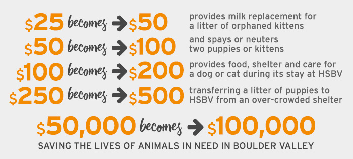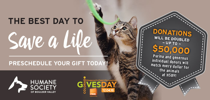 Thanks to year-round partner, Purina, and individual supporters, when you schedule your Colorado Gives Day gift each dollar your give will be matched – up to $50,000!